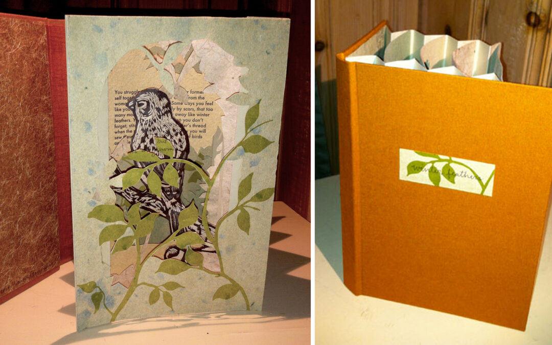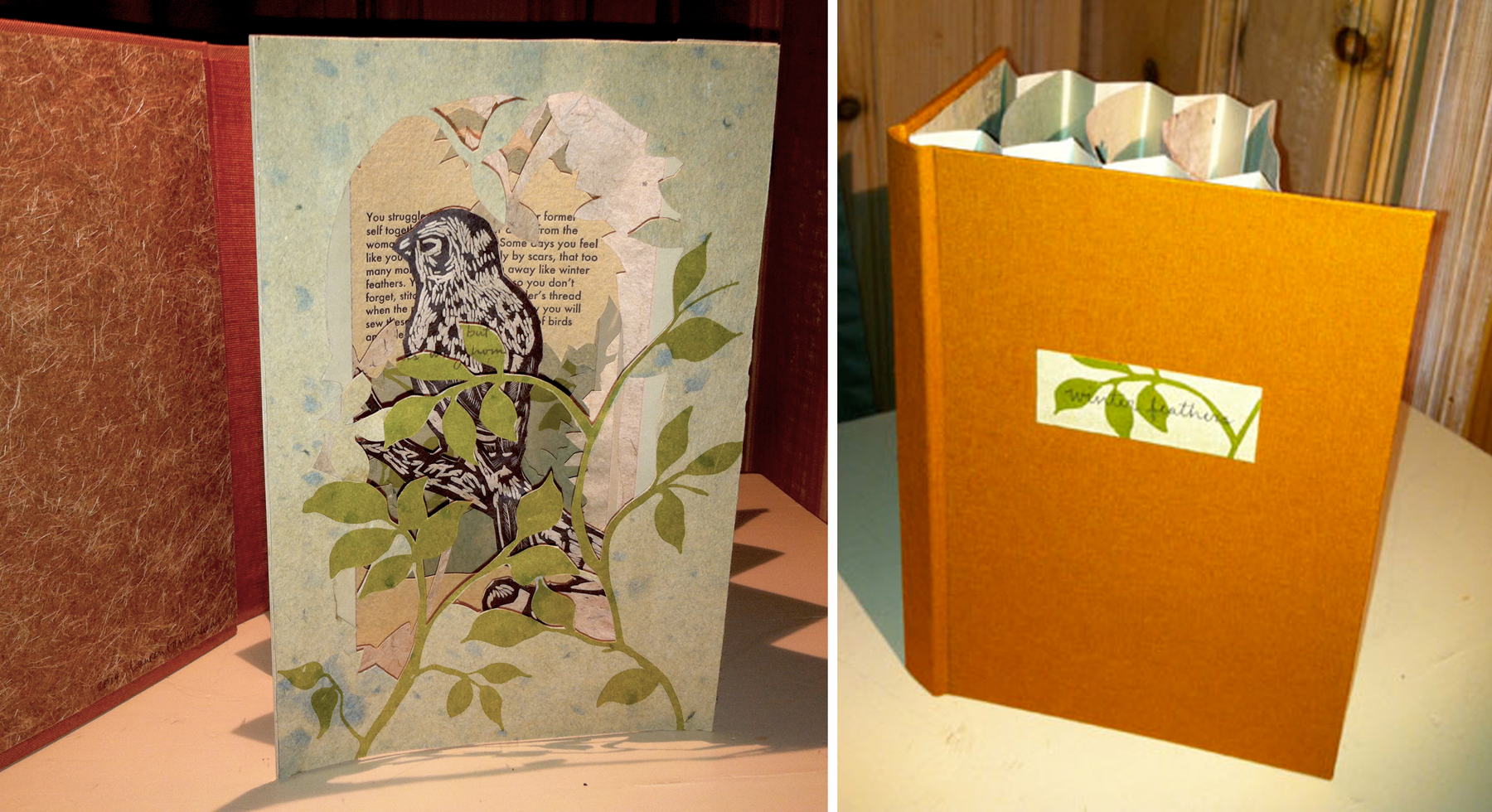 Winter Feathers is a letterpress-printed tunnel book made entirely of handmade paper. Text compares the author’s romantic encounters to observed bird behavior. An extension of the limited edition book “Migration: A Field Guide to Love That Was and Might Have Been.”