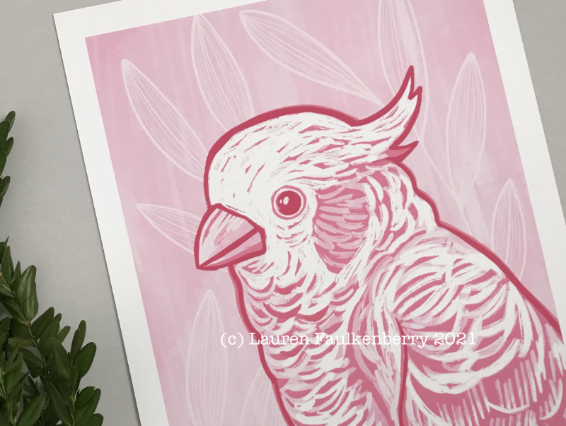 Some of my favorite drawings from the last year started as a goofy little doodle—something that I just started sketching out of the blue, as a way to relax and attempt something new. One of those drawings became the cockatoo pictured above. I don’t often use pink in my color palette, but that’s the way this one started. I played around with mark-making (this was drawn on my iPad) and found that it was easy to mimic a woodcut style by using special brushes. By the time I finished the drawing, I really wanted to carve this cockatoo into some wood panels and make it into a woodcut. (I think that’ll still happen in the coming months.)