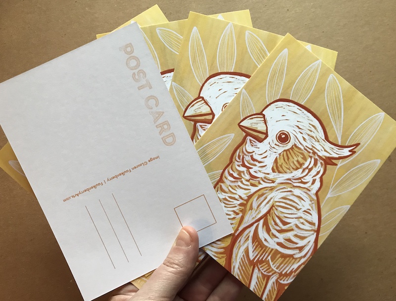 Bonus: I liked this little gold cockatoo so much that I decided to use it for a postcard. I like to include a fun freebie card or postcard with each of my Etsy orders, and I wanted to use a new design, so this seemed like a perfect match. I had these postcards printed to test out a new paper (spoiler: it’s awesome) and now I’m excited to send little birds out with each order.