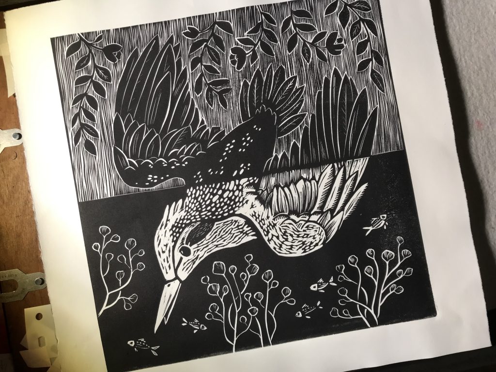 It’s linocut time! For the past few months I’ve been working on a new series of larger linocut prints (like the kingfisher here, above). I’ve been really excited to spend more time on printing lately, which is something that has been pushed to the back burner for too long.